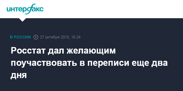 Москва. 27 октября. INTERFAX.RU - Желающие поучаствовать в переписи населения, которая официально закончилась на большей части территории страны РФ в понедельник, могут в течение еще двух дней оставить сведения о себе на стационарных переписных участках, сообщил глава Росстата Александр Суринов.