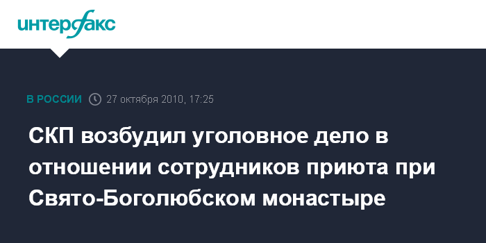 Москва. 27 октября. INTERFAX.RU - Органы СКП по Владимирской области возбудили уголовное дело по статье о незаконном лишении свободы в связи с заявлениями воспитанниц Свято-Боголюбского женского монастыря о жестоком обращении с ними, сообщает сайт СКП в среду.