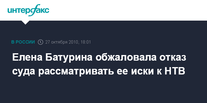 Москва. 27 октября. INTERFAX.RU - Президент ЗАО "Интеко" Елена Батурина обжаловала в Московском городском суде определения Пресненского суда Москвы, отказавшегося принять к рассмотрению ее иски к телеканалу НТВ с требованием опровергнуть ложные сведения о бизнесе заявителя, прозвучавшие, по мнению Батуриной, в ряде телепрограмм.