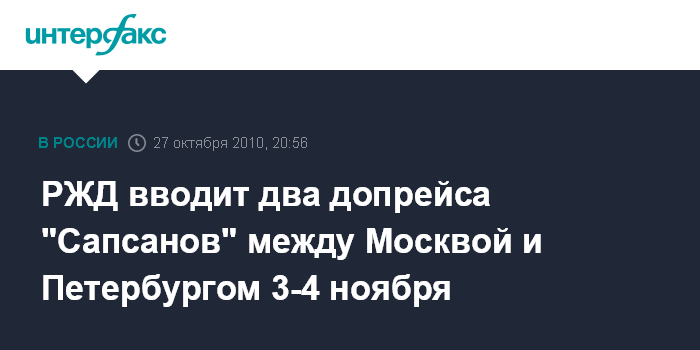 Москва. 27 октября. INTERFAX.RU - ОАО "Российские железные дороги" (РТС: RZHD) (РЖД) вводит 2 дополнительных рейса высокоскоростных поездов "Сапсан" между Москвой и Санкт-Петербургом на праздничные дни ноября, сообщила пресс-служба компании.
