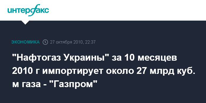 "Нафтогаз Украины" за 10 месяцев 2010 г импортирует около 27 млрд куб. м газа - "Газпром"
