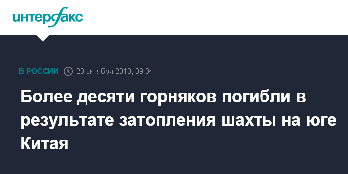 Пекин. 28 октября. INTERFAX.RU - В городе Аньшунь южной китайской провинции Гуйчжоу погибли 12 горняков в результате затопления в минувшую среду угольной шахты, сообщили местные СМИ в четверг.