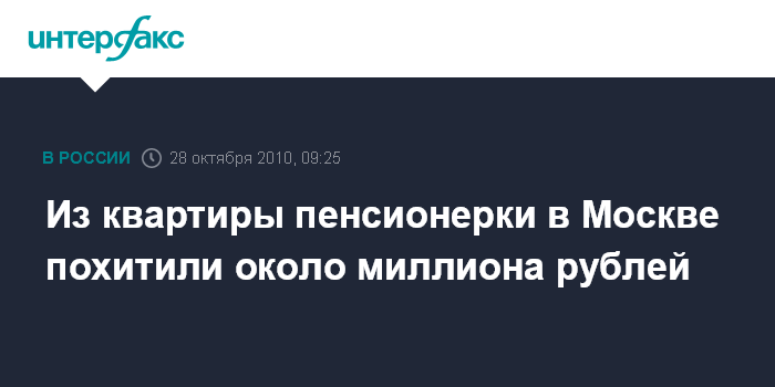Москва. 28 октября. INTERFAX.RU - Около 1 млн рублей похитили злоумышленники из квартиры пенсионерки на западе столицы, сообщил "Интерфаксу" источник в правоохранительных органах города.