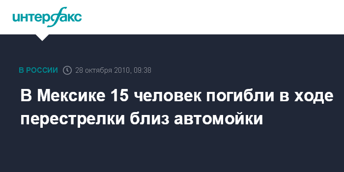 Вашингтон. 28 октября. INTERFAX.RU - Не мене 15 человек погибли во время перестрелки, произошедшей возле автомойки на западе Мексики, сообщает в четверг американский телеканал CNN.