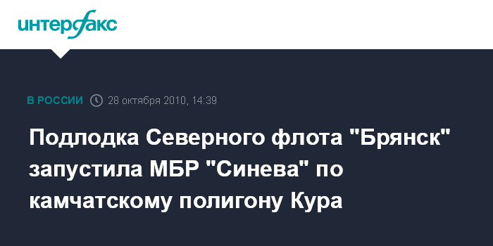 Москва. 28 октября. INTERFAX.RU - Атомный ракетный подводный крейсер стратегического назначения (РПКСН) Северного флота К-117 "Брянск" произвел учебно-боевой пуск межконтинентальной баллистической ракеты Р-29РМУ2 "Синева" из акватории Баренцева моря по полигону Кура на Камчатке, сообщил "Интерфаксу" в четверг источник в Главном штабе ВМФ.