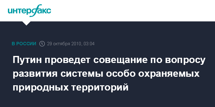 Москва. 29 октября. ИНТЕРФАКС - Премьер-министр РФ Владимир Путин проведет в пятницу совещание по вопросу о Концепции развития системы особо охраняемых природных территорий (ООПТ) федерального значения на период до 2020 года.