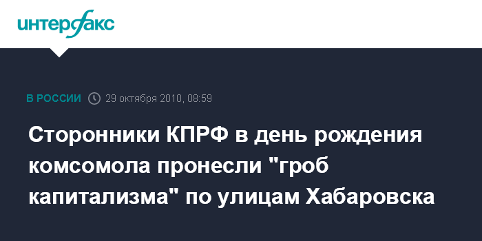 Хабаровск. 29 октября. INTERFAX.RU - Порядка 50 членов Союза коммунистической молодежи РФ и сторонников КПРФ в пятницу в день рождения комсомола приняли участие в акции "Антикапитализм - 2010", которая завершилась шествием по центральным улицам Хабаровска, передал корреспондент агентства "Интерфакс".
