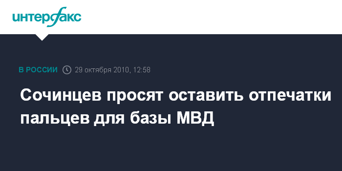 Сочи. 29 октября. INTERFAX.RU - Руководство УВД Сочи призвало горожан пройти добровольную дактилоскопическую регистрацию.