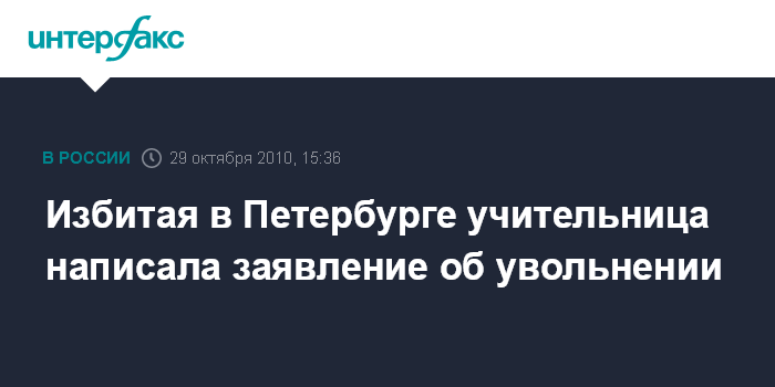 Санкт-Петербург. 29 октября. INTERFAX.RU - Учительница начальных классов петербургской школы, которую несколько дней назад при детях избил мужчина, написала заявление об увольнении, но директор уговорил ее подождать с уходом.