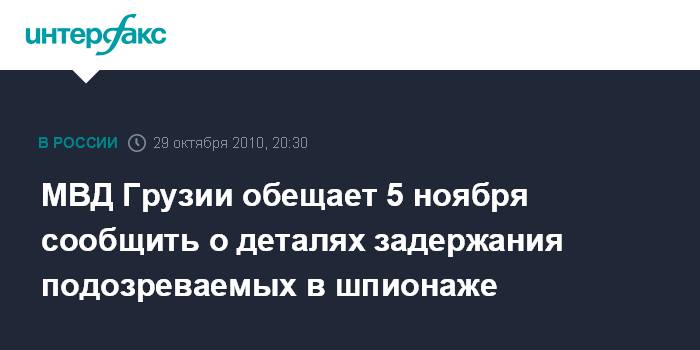 Тбилиси. 29 октября. INTERFAX.RU - В МВД Грузии заявляют, что по вопросу задержания в Грузии подозреваемых в шпионаже в пользу России 5 ноября будет проведена пресс-конференция.