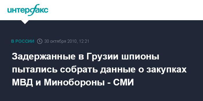 Тбилиси. 30 октября. INTERFAX.RU - МВД Грузии по-прежнему не комментирует информацию западных СМИ о задержании группы грузинских граждан по обвинению в шпионаже в пользу России. Между тем грузинское информационное агентство "Интерпрессньюс" сообщает в субботу со ссылкой на свой источник, что задержанные работали на Главное разведывательное управление Генштаба Российской Федерации. По информации грузинского агентства, группа граждан пыталась собрать информацию о закупках МВД и Минобороны страны, данные о высокопоставленных лицах в грузинских силовых структурах.