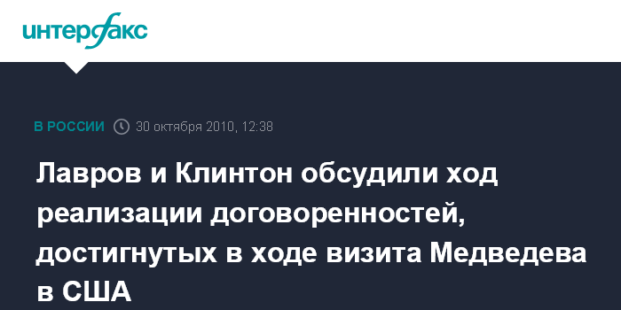 Лавров и Клинтон обсудили ход реализации договоренностей, достигнутых в ходе визита Медведева в США