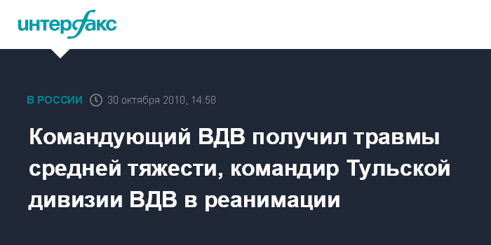 Командующий ВДВ получил травмы средней тяжести, командир Тульской дивизии ВДВ в реанимации