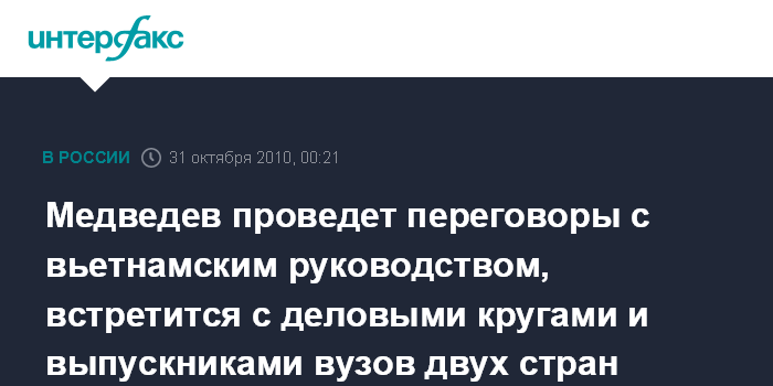 Ханой. 31 октября. ИНТЕРФАКС - Президент РФ Дмитрий Медведев, впервые находящийся с официальным визитом во Вьетнаме, проведет в воскресенье переговоры с руководством этой страны.
