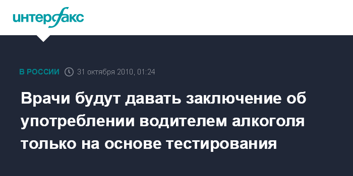 Москва. 31 октября. ИНТЕРФАКС - Вступил в силу приказ Минздравсоцразвития РФ, обязывающий врачей давать заключение о состоянии опьянения водителей только на основе тестирования по уровню алкоголя в организме, без учета сопутствующих признаков.