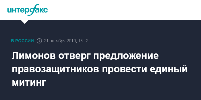 Москва. 31 октября. INTERFAX.RU - Лидер оппозиционной коалиция "Другая Россия" Эдуард Лимонов ответил отказом на предложение правозащитников не проводить альтернативный митинг в воскресенье вечером на Триумфальной площади Москвы. Из-за раскола среди организаторов акции 31 октября на Триумфальной площади ожидается проведение двух митингов - согласованного с властями с участием 800 человек и альтернативного митинга сторонников Э.Лимонова. Э.Лимонов заявил "Интерфаксу" в воскресенье, что он отвергает предложение правозащитников о проведении совместной акции. "Какие предложения? Пусть они отвечают перед людьми", - сказал он.