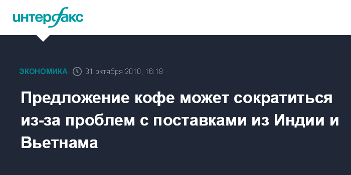Лондон. 31 октября. INTERFAX.RU - Мировое предложение кофе может сократиться, что приведет к росту цен, поскольку Индия прогнозируют задержку поставок из-за затяжных дождей, а Вьетнам ожидает сокращения урожая. Сбор урожая кофе в Индии, как ожидается, начнется в середине ноября - на 3 недели позже обычного, заявил в интервью Bloomberg президент индийской Ассоциации экспортеров кофе Рамеш Раджа. Между тем Вьетнам прогнозирует сокращение урожая кофе в 2010-2011 сельскохозяйственном году на 3% - до 1,1 млн тонн. Цена кофе арабика на этой неделе подскочила до $2,046 за фунт - рекордного уровня с августа 1997 года.
