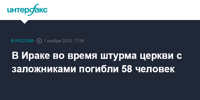 Вашингтон. 1 ноября. ИНТЕРФАКС - Пятьдесят восемь человек убиты, 75 человек получили ранения в ходе штурма иракским спецназом захваченной боевиками "Аль-Каиды" католической церкви в Багдаде, сообщает в понедельник американская телекомпания СNN со ссылкой на заявление МВД Ирака.