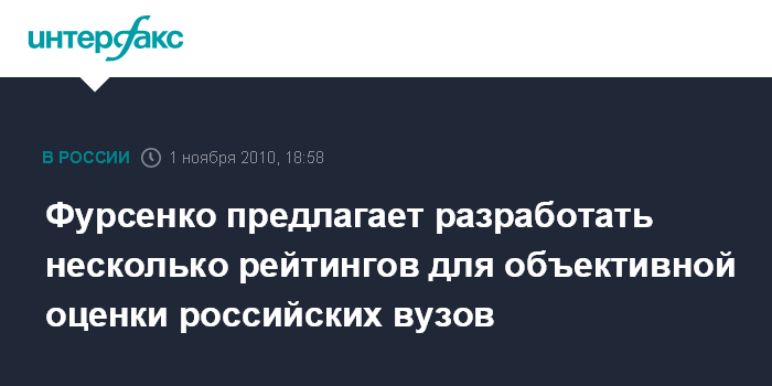 "Рейтинг (составленный информационным агентством "Интерфакс" и радиостанцией "Эхо Москвы" - ИФ) составлен достаточно квалифицированно и позволяет оценить вузы. Думаю, что этот рейтинг не должен оставаться в гордом одиночестве, всегда неплохо, когда есть 2-3 рейтинга, которые можно сравнить", - сообщил Фурсенко агентству "Интерфакс" в понедельник.