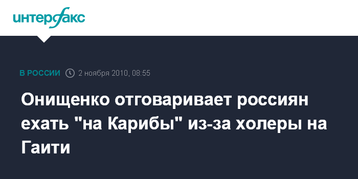 Москва. 2 ноября. INTERFAX.RU - Медики советуют российским гражданам без особой необходимости не ездить в Карибский регион из-за вспышки холеры на Гаити.