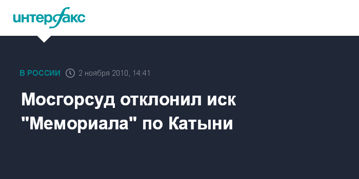 Москва. 2 ноября. INTERFAX.RU - Мосгорсуд во вторник отклонил иск правозащитного общества "Мемориал" о признании незаконным решения о засекречивании постановления Главной военной прокуратуры (ГВП) РФ о прекращении расследования катынского дела.