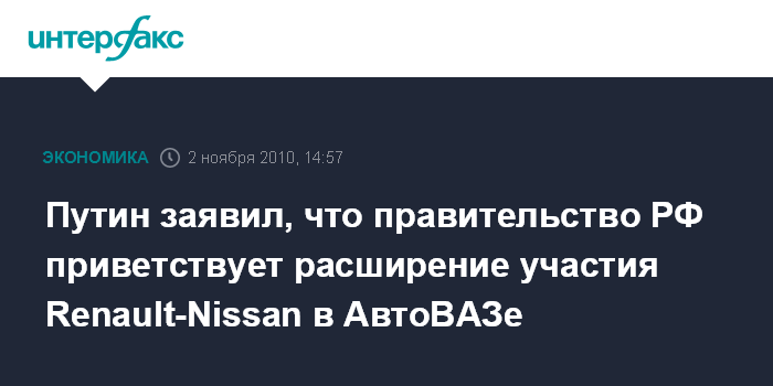 Ново-Огарево. 2 ноября. INTERFAX.RU - Правительство РФ приветствует в случае договоренности возможность расширения участия Renault-Nissan в капитале "АвтоВАЗа".