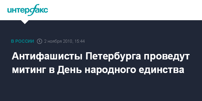 Санкт-Петербург. 2 ноября. INTERFAX.RU - Петербургские антифашисты намерены в День народного единства провести митинг против национализма, сообщила пресс-служба общественного движения "Защити город от фашизма" во вторник.