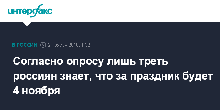 Москва. 2 ноября. INTERFAX.RU - Название праздника, отмечаемого 4 ноября, не известно 29% россиян, свидетельствуют данные всероссийского опроса, проведенного 22-25 октября социологами "Левада-Центра".