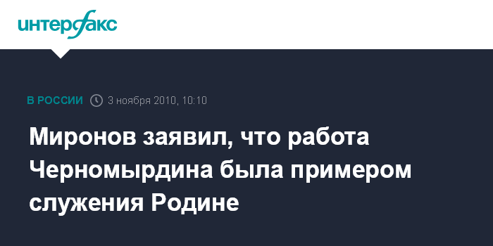 Москва. 3 ноября. INTERFAX.RU - Вся деятельность политика Виктора Черномырдина была примером служения Родине и честного выполнения своего долга, считает спикер Совета Федерации Сергей Миронов.