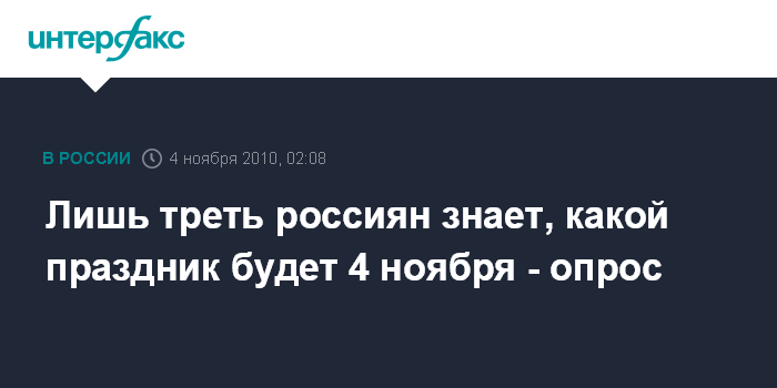 Москва. 4 ноября. ИНТЕРФАКС - Название праздника, отмечаемого 4 ноября, не известно 29% россиян, свидетельствуют данные всероссийского опроса, проведенного 22-25 октября социологами "Левада-Центра".