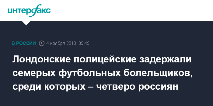Лондон. 4 ноября. ИНТЕРФАКС - По итогам футбольного матча Лиги чемпионов между командами "Челси" (Лондон) и "Спартак" (Москва) сотрудники британской полиции задержали семерых футбольных болельщиков, среди которых - четверо россиян.