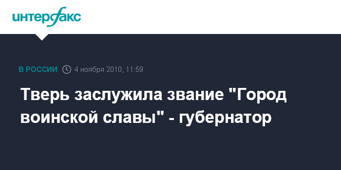 Тверь. 4 ноября. INTERFAX.RU - Губернатор Тверской области Дмитрий Зеленин считает, что Тверь по заслугам удостоена звания "Город воинской славы". "У нашего города были достойные конкуренты, которые также весьма обоснованно рассчитывали на присвоение звания "Города воинской славы". Но, как патриот нашей области, я болел всей душой за Тверь, и рад, что Тверь получила это звание", - сказал в четверг Д.Зеленин "Интерфаксу". По его словам, это высокая оценка городу, который во все века своего существования служил Отечеству.