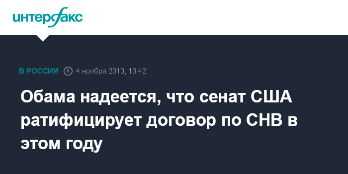 Лондон. 4 ноября. INTERFAX.RU - Президент США Барак Обама выразил надежду на то, что договор о стратегических наступательных вооружениях (СНВ) будет ратифицирован сенатом США до конца текущего года, передает Би-би-си. Договор об СНВ был подписан президентами США и России в Праге 8 апреля. Срок действия предыдущего договора истек в декабре прошлого года. Новый документ предусматривает сокращение каждой из сторон примерно на треть - до 1550 - числа стратегических боеголовок. Для вступления в силу договор должен быть ратифицирован парламентами России и США.