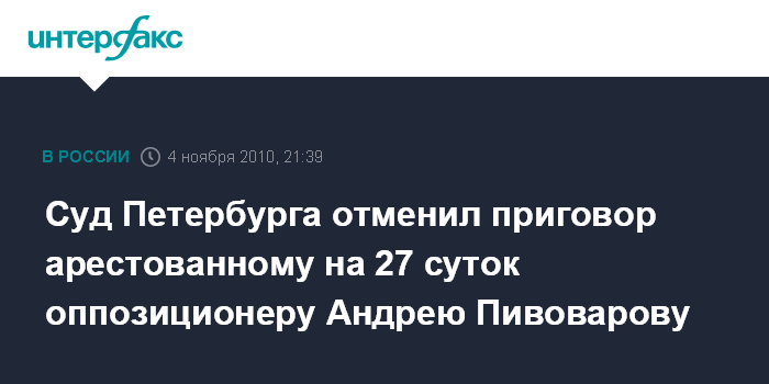 Санкт-Петербург. 4 ноября. ИНТЕРФАКС-СЕВЕРО-ЗАПАД - Куйбышевский районный суд Петербурга отменил два приговора арестованному на 27 суток за участие в митингах оппозиции лидеру петербургского отделения Российского народно-демократического союза (РНДС) Андрею Пивоварову.