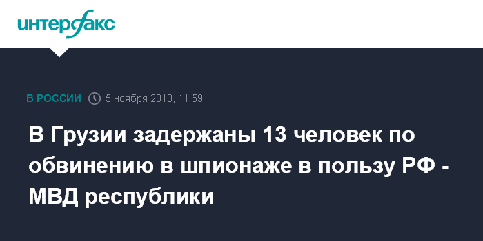 Тбилиси. 5 ноября. INTERFAX.RU - Официальный Тбилиси заявляет о задержании 13 граждан Грузии по подозрению в шпионаже в пользу РФ. Соответствующее сообщение размещено в пятницу на официальном сайте МВД Грузии. Сообщается, что задержаны Бакур Кигурадзе, Вячеслав Плужников, Габриел Усталишвили, Давидзе Месхидзе, Белла Какабадзе, Гоча Диасамидзе, Тариэл Абашидзе, Руслан Галогре, Эдуард Абдулаев, Армен Геврокян, Рубен Шикоян, Петре Девришадзе и Юрий Скрыльников.