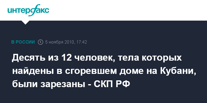 Десять из 12 человек, тела которых найдены в сгоревшем доме на Кубани, были зарезаны - СКП РФ