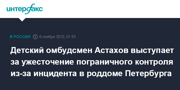 Москва. 5 ноября. ИНТЕРФАКС - Уполномоченный при президенте РФ по правам ребенка Павел Астахов предлагает ужесточить прохождение карантинной зоны на въезде в Россию в связи с инцидентом в роддоме Санкт-Петербурга, где у роженицы из Таджикистана был выявлен туберкулез.