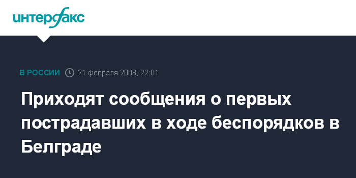Белград. 21 февраля. INTERFAX.RU - Около 30 человек, половина из которых - сербские полицейские, пострадали в ходе столкновений, которые возникли у зданий посольств США, Хорватии и Турции по окончании митинга против самопровозглашения независимости Косово в центре Белграда.