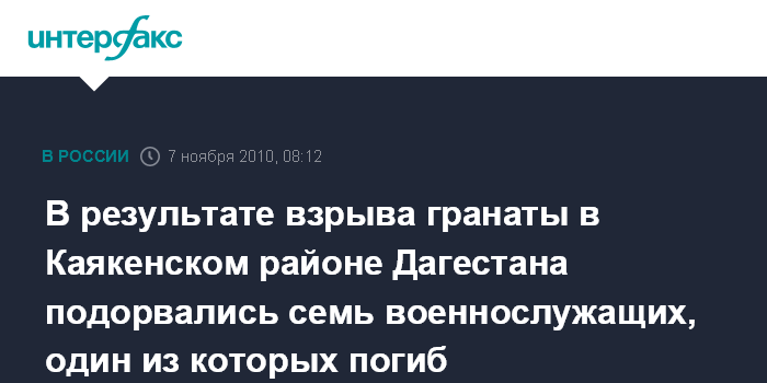 Ростов-на-Дону. 7 ноября. ИНТЕРФАКС-ЮГ - Один военнослужащий РФ погиб, еще шестеро пострадали в результате взрыва гранаты в Каякенском районе Дагестана, сообщили агентству "Интерфакс-Юг" в правоохранительных органах Дагестана.