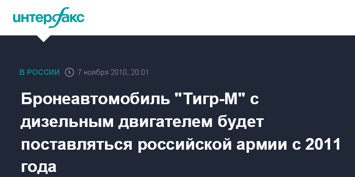 Москва. 7 ноября. ИНТЕРФАКС-АВН - Оснащение специального бронированного автомобиля "Тигр-М" отечественным дизельным двигателем расширит на него спрос среди российских силовых структур и позволит поставлять его в Вооруженные силы, убеждены производители.