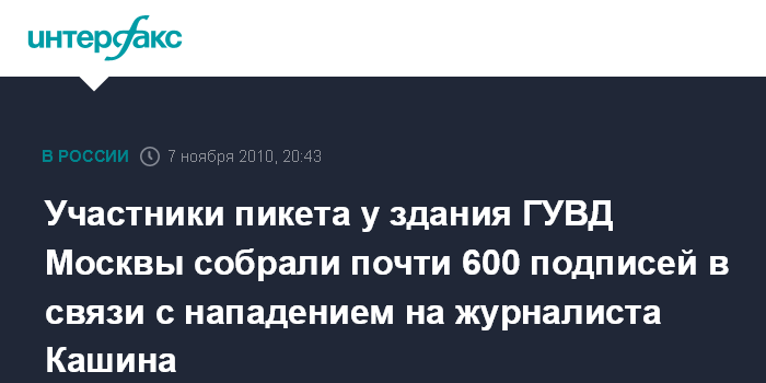 Москва. 7 ноября. ИНТЕРФАКС-МОСКВА - Свыше 560 подписей под обращением к президенту РФ с призывом тщательно расследовать нападение на обозревателя "Коммерсанта" Олега Кашина собрано в воскресенье в ходе пикета возле здания ГУВД Москвы на улице Петровка, 38, сообщили "Интерфаксу" организаторы сбора подписей.