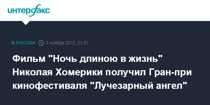 Москва. 7 ноября. ИНТЕРФАКС - Российский фильм "Ночь длиною в жизнь режиссера Николая Хомерики удостоен Гран-при 7-го Международного благотворительного кинофестиваля "Лучезарный ангел".