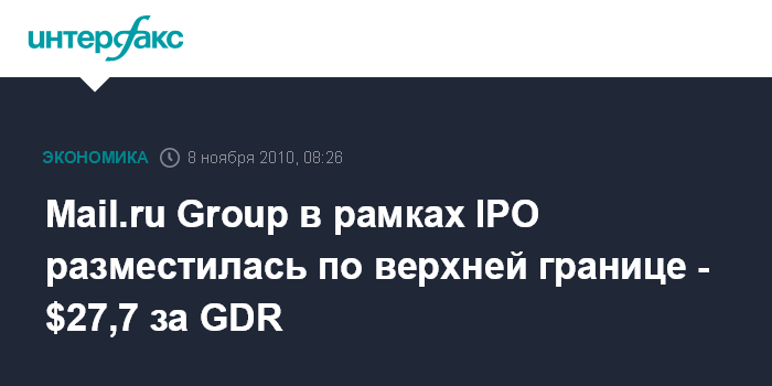 Mail.ru Group в рамках IPO разместилась по верхней границе - $27,7 за GDR