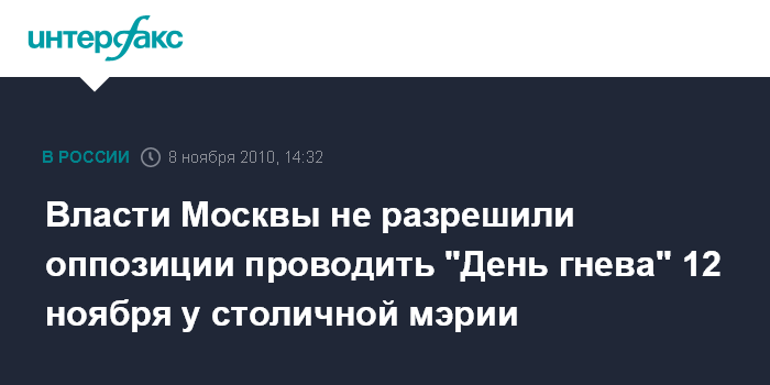 Москва. 8 ноября. INTERFAX.RU - Московские власти отказали оппозиционерам в согласовании протестной акции "День гнева", запланированной на 12 ноября.