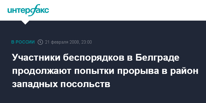 Москва. 21 февраля. INTERFAX.RU - Район Белграда, где расположены посольства оцеплен полицейскими, охрана правительственных зданий усилена военными, сообщает телеканал Вести 24.