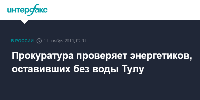 Тула. 11 ноября. ИНТЕРФАКС - Прокуратура Тульской области проводит проверку в связи с прекращением подачи электроэнергии Тулгорводоканалу, сообщает в четверг сайт областной прокуратуры.