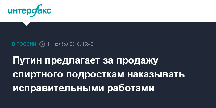 Москва. 11 ноября. INTERFAX.RU - Премьер-министр РФ Владимир Путин предлагает ввести уголовную ответственность за неоднократную продажу алкоголя несовершеннолетним.
