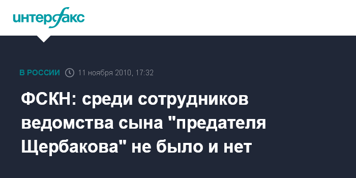 Москва. 11 ноября. INTERFAX.RU - В Федеральной службе РФ по Наркоконтролю официально заявили, что в органах ФСКН среди бывших и действующих сотрудников нет сына "предателя Щербакова", который, по некоторым данным, инициировал российско-американский шпионский скандал.