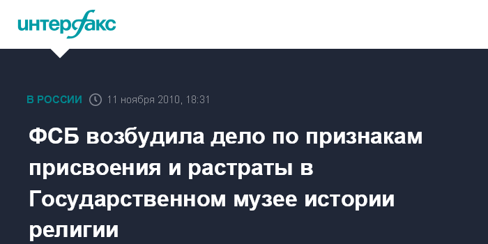 Санкт-Петербург. 11 ноября. INTERFAX.RU - Следственные органы УФСБ по Петербургу и Ленобласти возбудили уголовное дело по признакам присвоения и растраты в Государственном музее истории религии, сообщили "Интерфаксу" в пресс-службе ведомства в четверг.