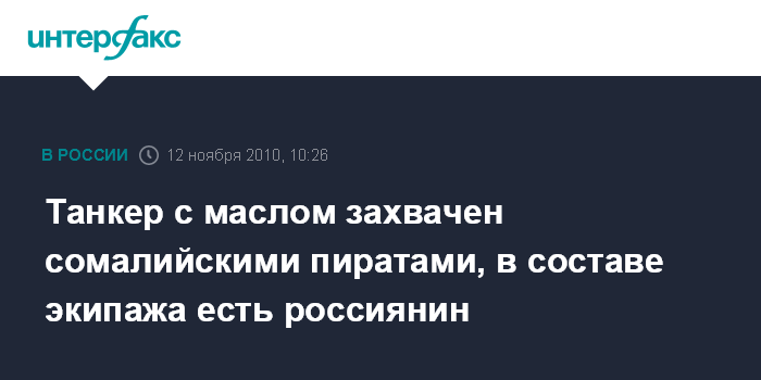 Москва. 12 ноября. INTERFAX.RU - Сомалийские пираты захватили в Аравийском море танкер-химовоз, один из членов экипажа - россиянин.